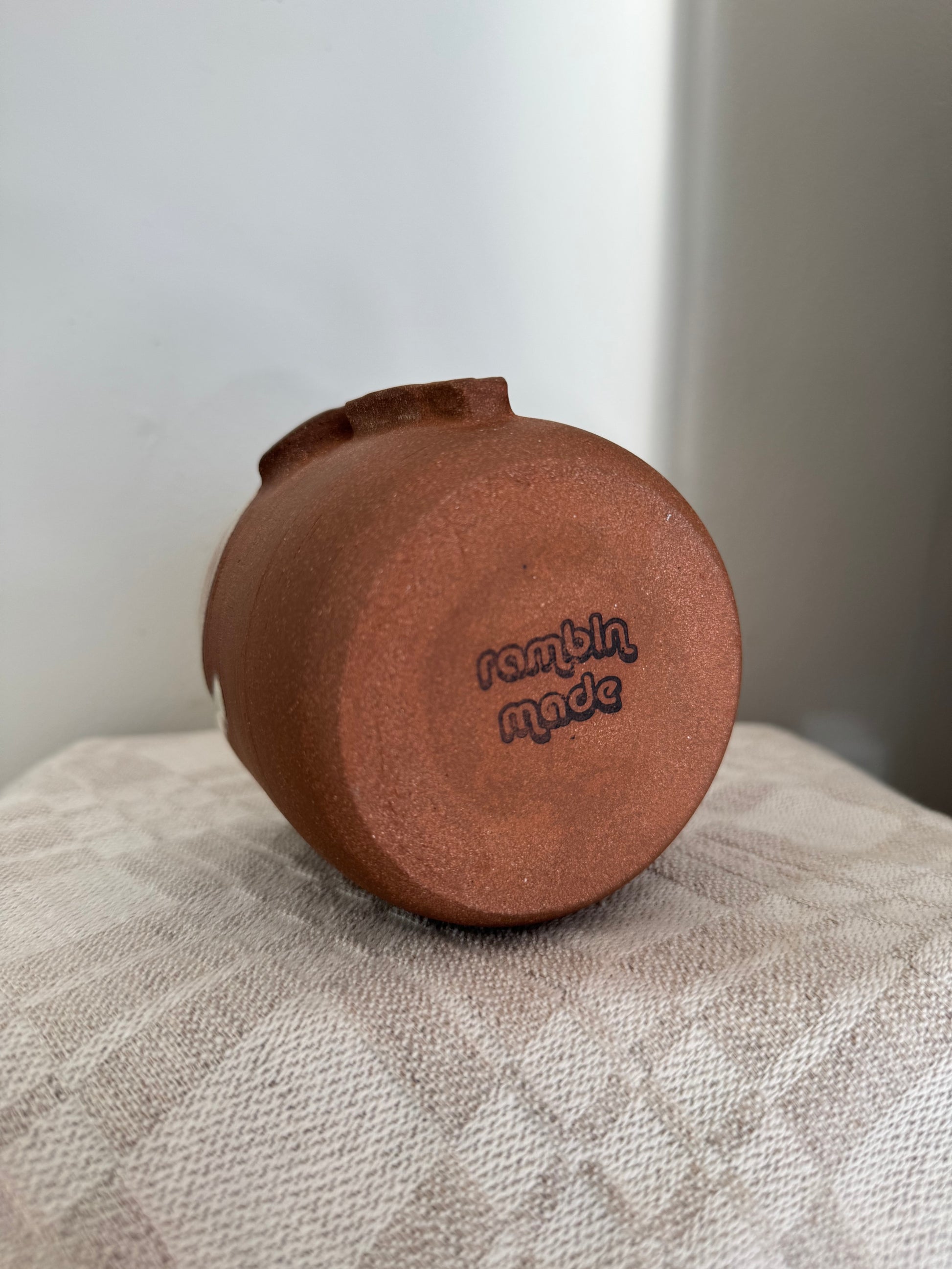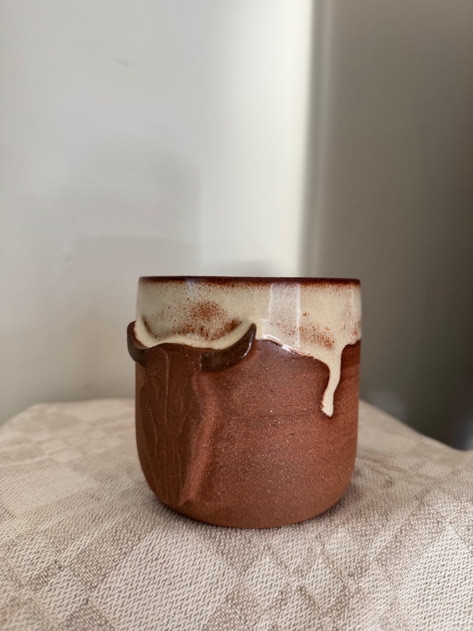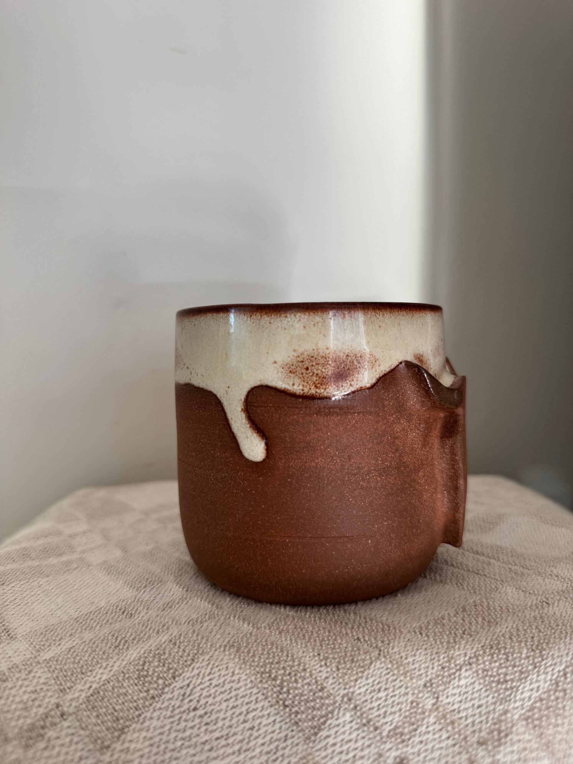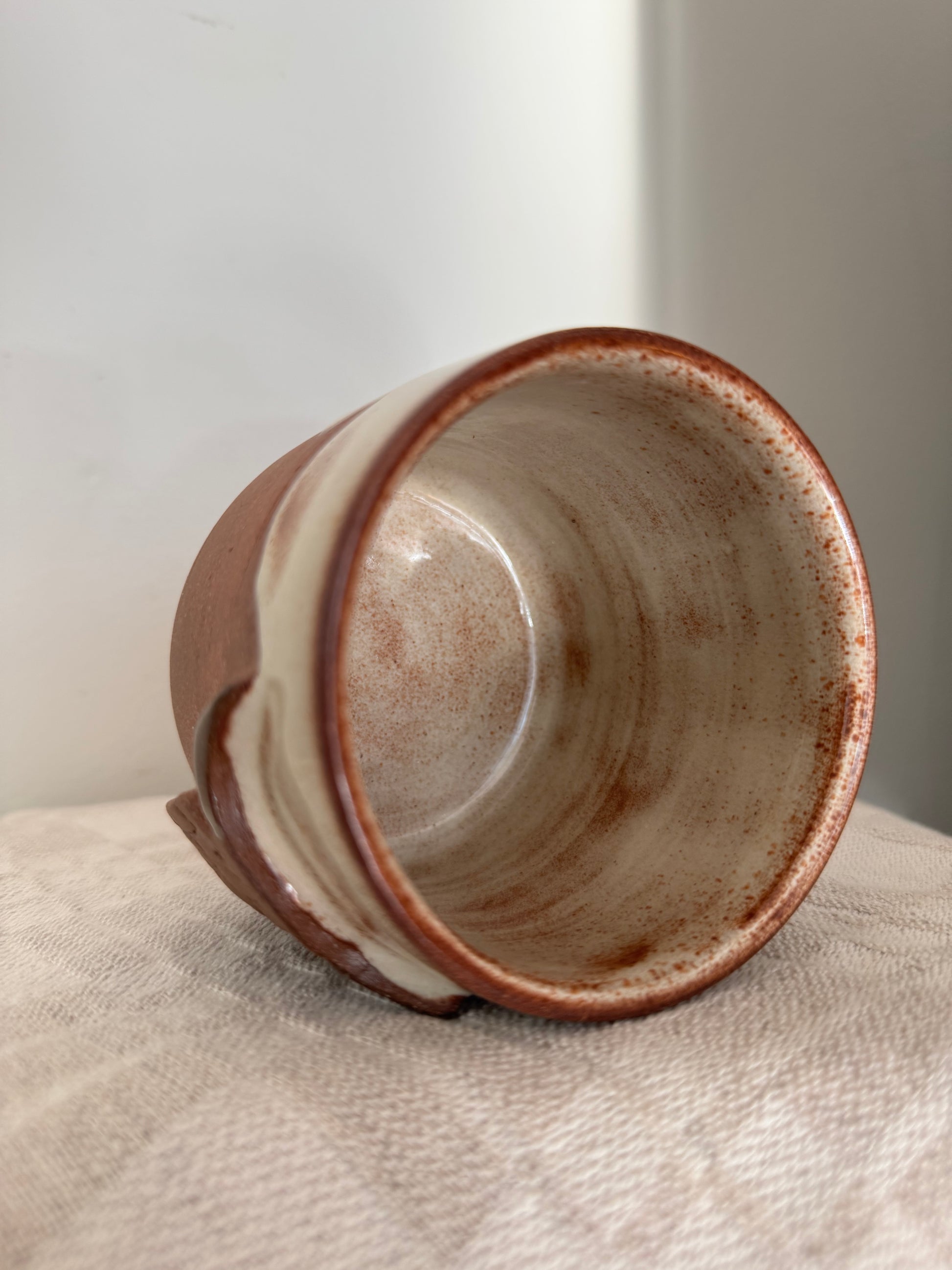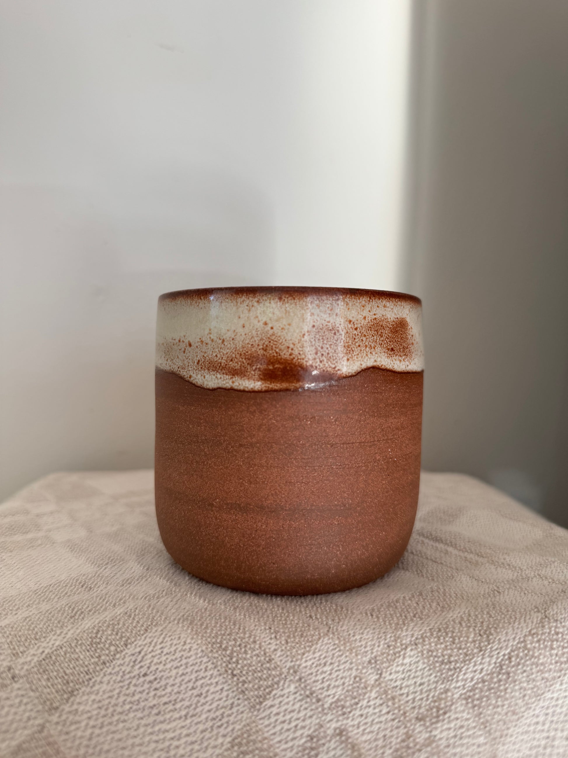 Dark brown stoneware tumbler with creamy rust coloured glaze.